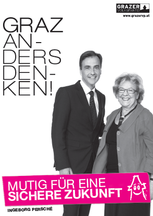 Ingeborg Persché: Die ungewöhnliche Kandidatin Ich stelle mich der Wahl! Als erfahrene Kommunalpolitikerin und als einzige Vertreterin der Grazer Wirtschaft und der Grazer Senioren. Ich möchte Graz nicht nur als seniorenfreundliche Stadt positionieren, sondern auch für aktive unternehmerische ältere Menschen eine Plattform sein. Denn, ältere Menschen gehören noch lange nicht zum alten Eisen! Wenn Sie auch dieser Meinung sind, dann geben Sie mir bitte am 25. November Ihre Vorzugsstimme auf dem Gemeinderatswahlzettel: Ingeborg Persché - Liste 2, ÖVP Bisherige politische Aktivitäten: Seit 1987 im Vorstand der ÖVP-Innere Stadt. 1990 - 1993 Stadtparteiobmannstellvertreter. 1993 - 1996 Bezirksrätin. 1993 - 2003 Stadtvorsitzende der Frau in der Wirtschaft in der Wirtschaftskammer und Wirtschaftsbund. 1996 - 1998 und 2001 - 2003 Gemeinderätin der Stadt Graz. Seit 2004 Projektleiterin der Grazer ÖVP–Altmandatare und Herausgeberin der Grazer ÖVP-Chronik. Außerpolitische Tätigkeiten: 1972 – 1989 Vorstandsmitglied im Elternverein der Carnerischule. 1983 Gründungsmitglied und von 1998 – 2000 Präsidentin des internationalen Serviceclubs ZONTA in Graz. Seit 1998 in der Kerngruppe der „ Grazer Stadtidee“ und sei Oktober 2011 Obfrau. Seit 1996 Mitarbeiterin im TEAM-ON – Hilfe für Randgruppen. Seit 1997 Projektleiterin der „Partnerschaft unter Kindern Maribor-Sentilj–Graz“ in Zusammenarbeit mit Frau Mag. Ivanka Gruber, Präsidentin des „Vereins Österreichisch– Slowenische–Freundschaft“, und seit 2005 Rechnungsprüferin im Verein. |